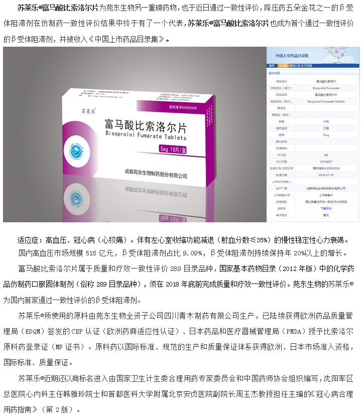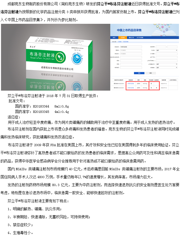 2019年7月25日,苑东生物芬立平®布洛芬注射液获批“用于6个月及以上儿科患者的解热和镇痛治疗”新适应症,有效地满足了国内6个月以上儿科患者退热、镇痛领域的安全用药需求。